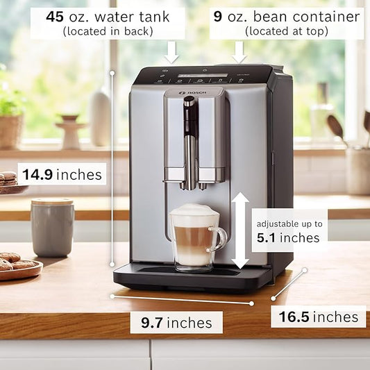 Bosch 300 Series Fully Automatic Espresso and Coffee Machine – In-Cup Frother, OneTouch Milk Drinks, 5 Drink Options, Ceramic Grinder, Easy Clean & Descale, in Silver TIU20307